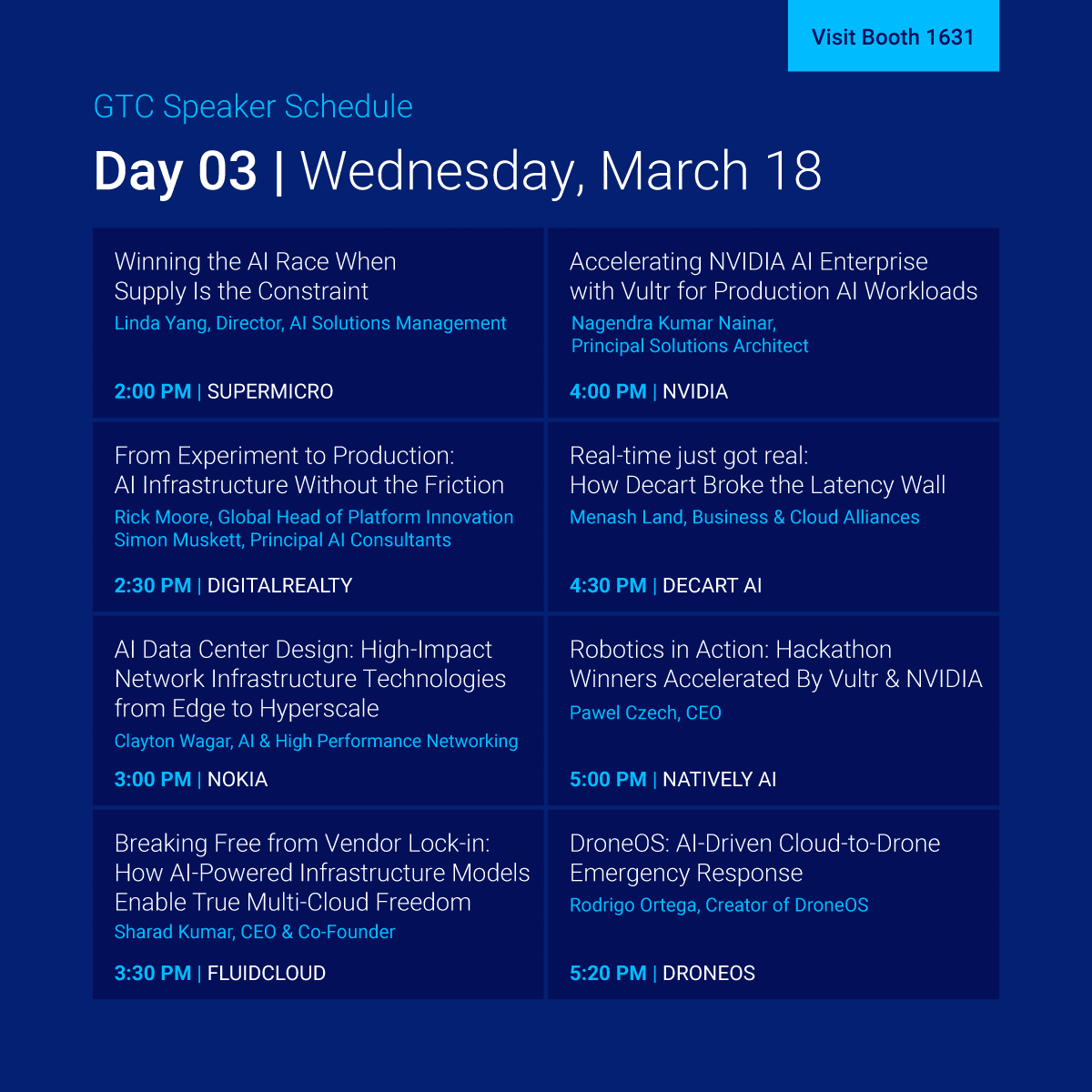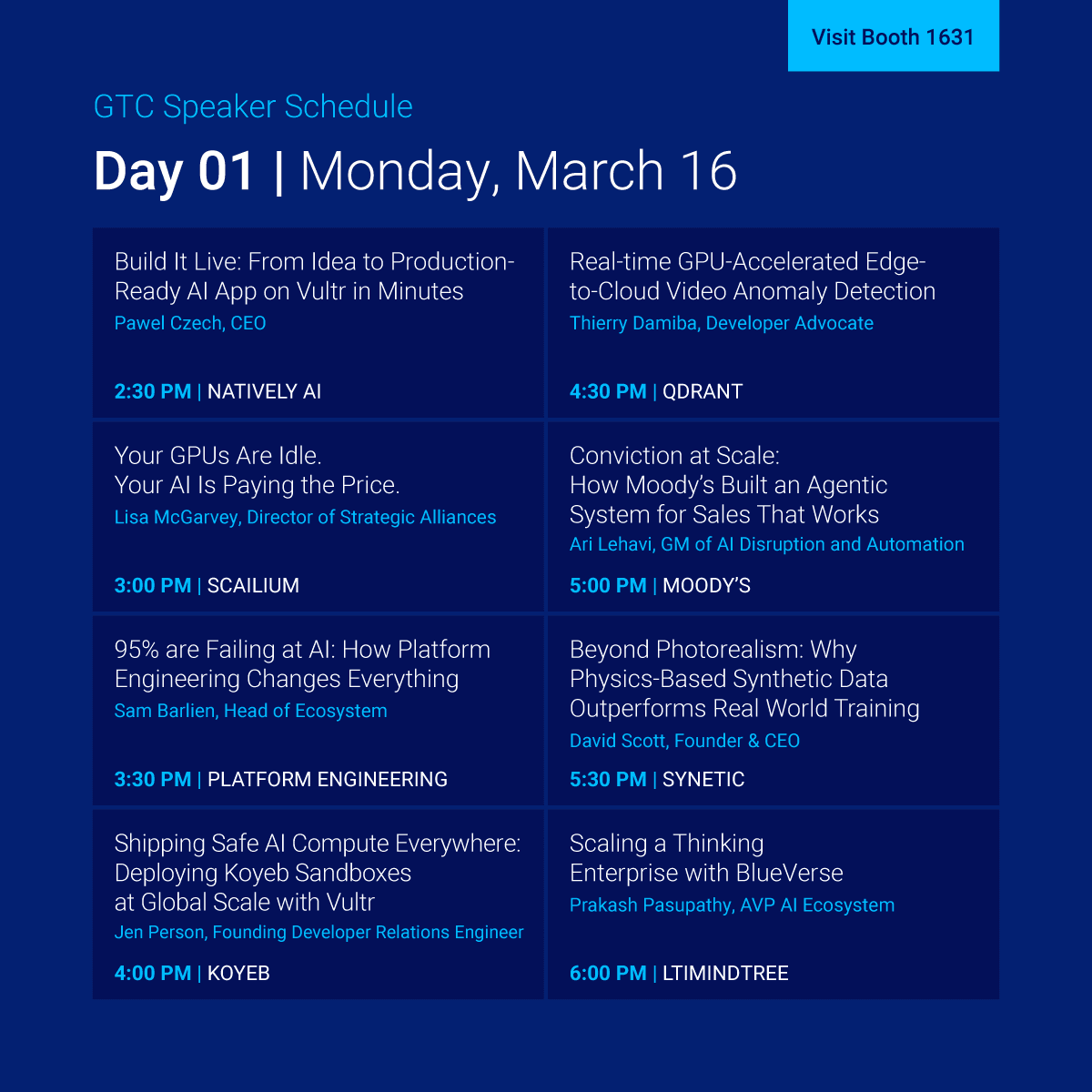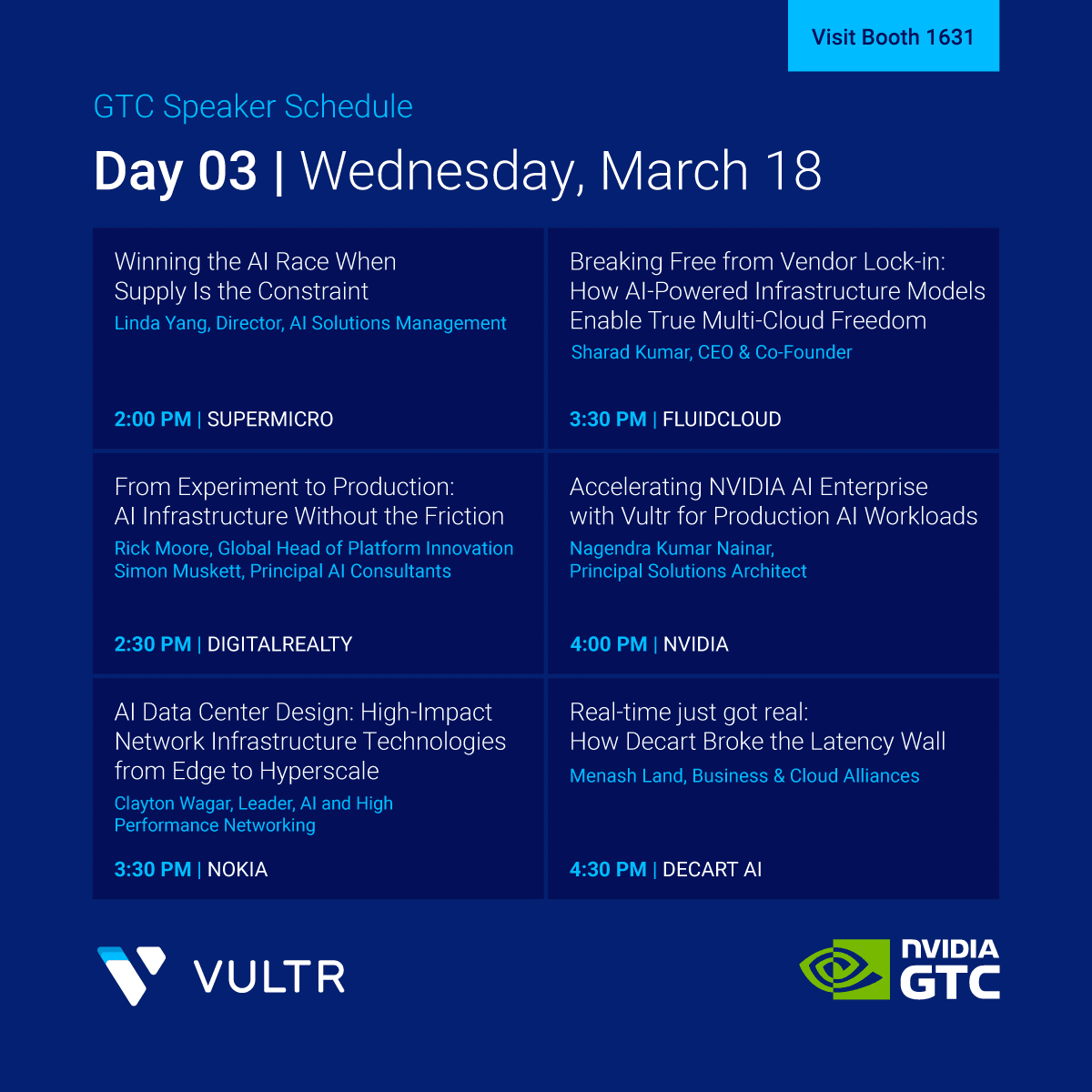 Whether you’re actively deploying AI or planning your next phase of growth, Vultr’s sessions are designed to deliver practical guidance you can apply immediately. We look forward to connecting with customers, partners, and the broader AI community throughout the event.