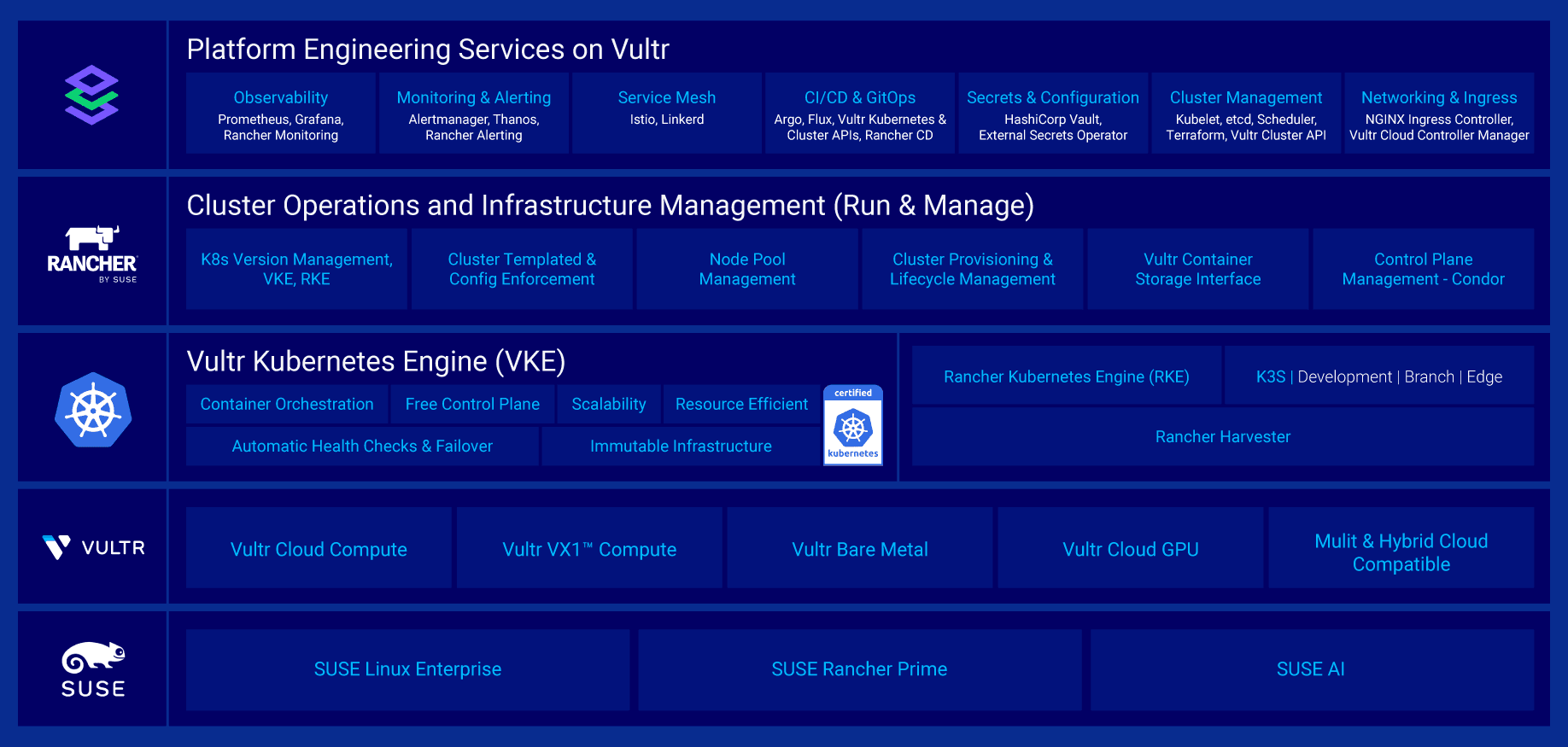 Vultr and SUSE share a commitment to open source and composable infrastructure. This collaboration combines SUSE Rancher Prime and SUSE AI with Vultr’s global cloud infrastructure, including cloud compute, bare metal, and Vultr Cloud GPU, delivering solutions optimized for performance, cost efficiency, and operational simplicity across Kubernetes and AI workloads.